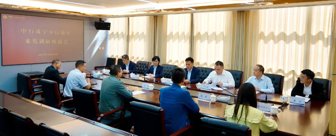 10月19日,中國銀行咸寧分行行長李俊敏、高級經理習燦碧率隊到城發(fā)集團進行調研并座談,中國銀行通城支行行長李斌紅、業(yè)務發(fā)展部主任余雷等陪同。城發(fā)集團黨委書記、董事長張偉,黨委副書記、總...